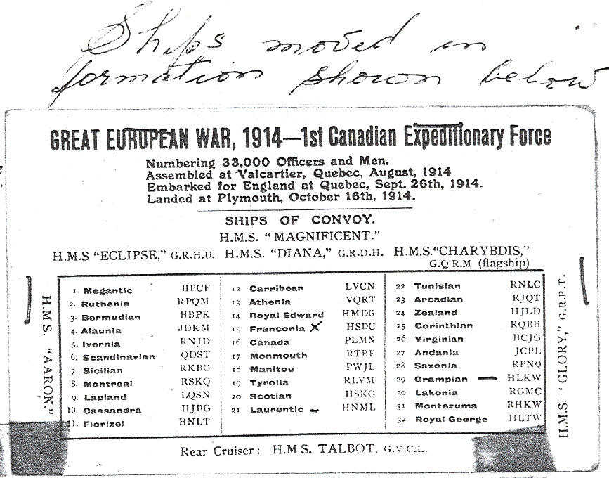 In the meantime a great armada of ships was assembling at Quebec City, perhaps the greatest in history; consisting of thirty transports and ten battleships; then came the day: "Orders to embark" and we left Val Cartier for Quebec, and to the waiting ships. As the ships were loaded they moved out to Gaspe Bay and took up their assigned positions in three lines 400 yards apart each way, and with the arrival of the last transport, the whole fleet, guarded on all sides with cruisers, moved off for Britain.