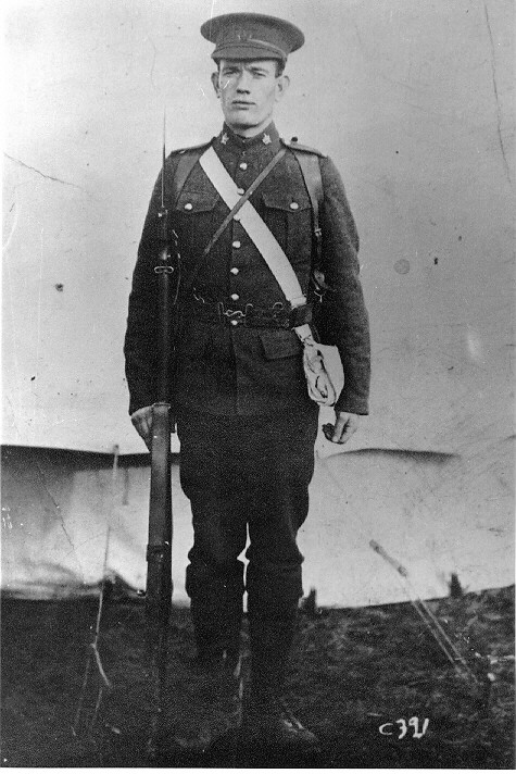 At the outbreak of World War 1, I was working for the Grand Trunk Pacific at Portage la Prairie. Four days later, which I think was August 14th 1914 I enlisted with the local militia unit there, namely the 99th Manitoba Rangers. Other units throughout the district were raised under their various militia names from Brandon, Winnipeg, Fort Francis, Port Arthur and Fort William, which on reaching their quota were entrained together, and on reaching Val Cartier, Quebec, were amalgamated to form the 8th Battalion, 90th Winnipeg Rifles.