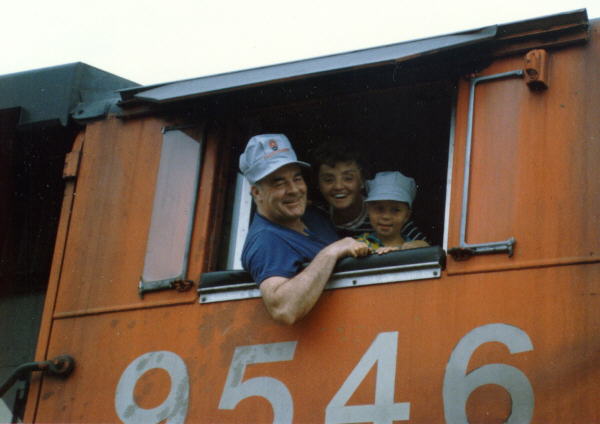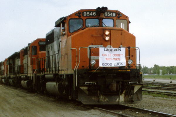 Lyle is accompanied by his wife Denise and his grandson, as he brings C.N. 9546 to a stop at Portage Jct. on his last trip as an engineman before retiring from the Canadian National Railway, June 1st, 1989.