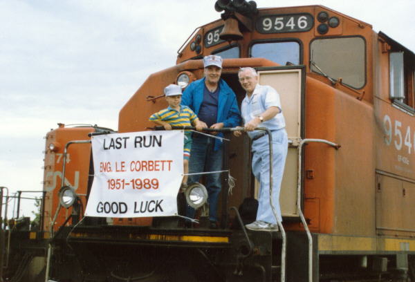 Engineman Lyle Corbet arrives at Portage Jct. on his last trip, June 1st, 1989