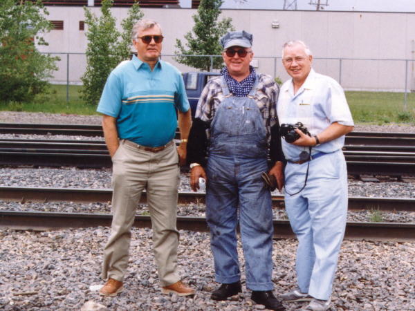 L/R: Forrest Finley, Neil Pow and Al Peden, out to greet Lyle Corbet on his last trip. Neil was running the Prairie Dog Special that day and is dressed to suit the occasion; the Prairie Dog being a coal fired steam engine.