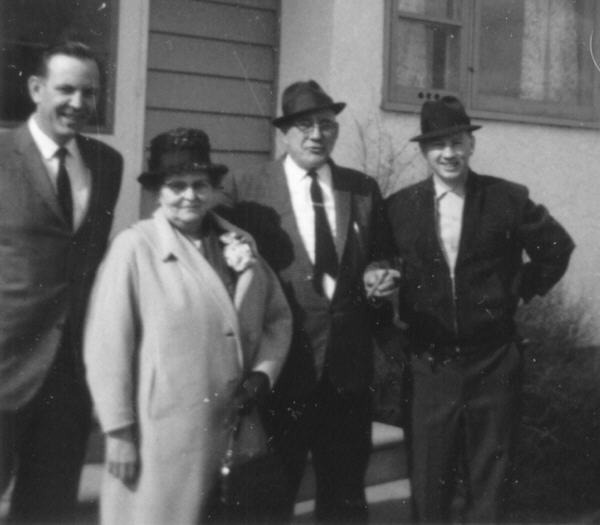 Uncle Freds last trip after retiring as conductor on trains No. 1 & 2, Winnipeg to Waterous, L/R: Fred Peden Jr., Aunt Eva, Conductor Fred Peden, Allan Peden, May 1966. Photo: Fred Jr.