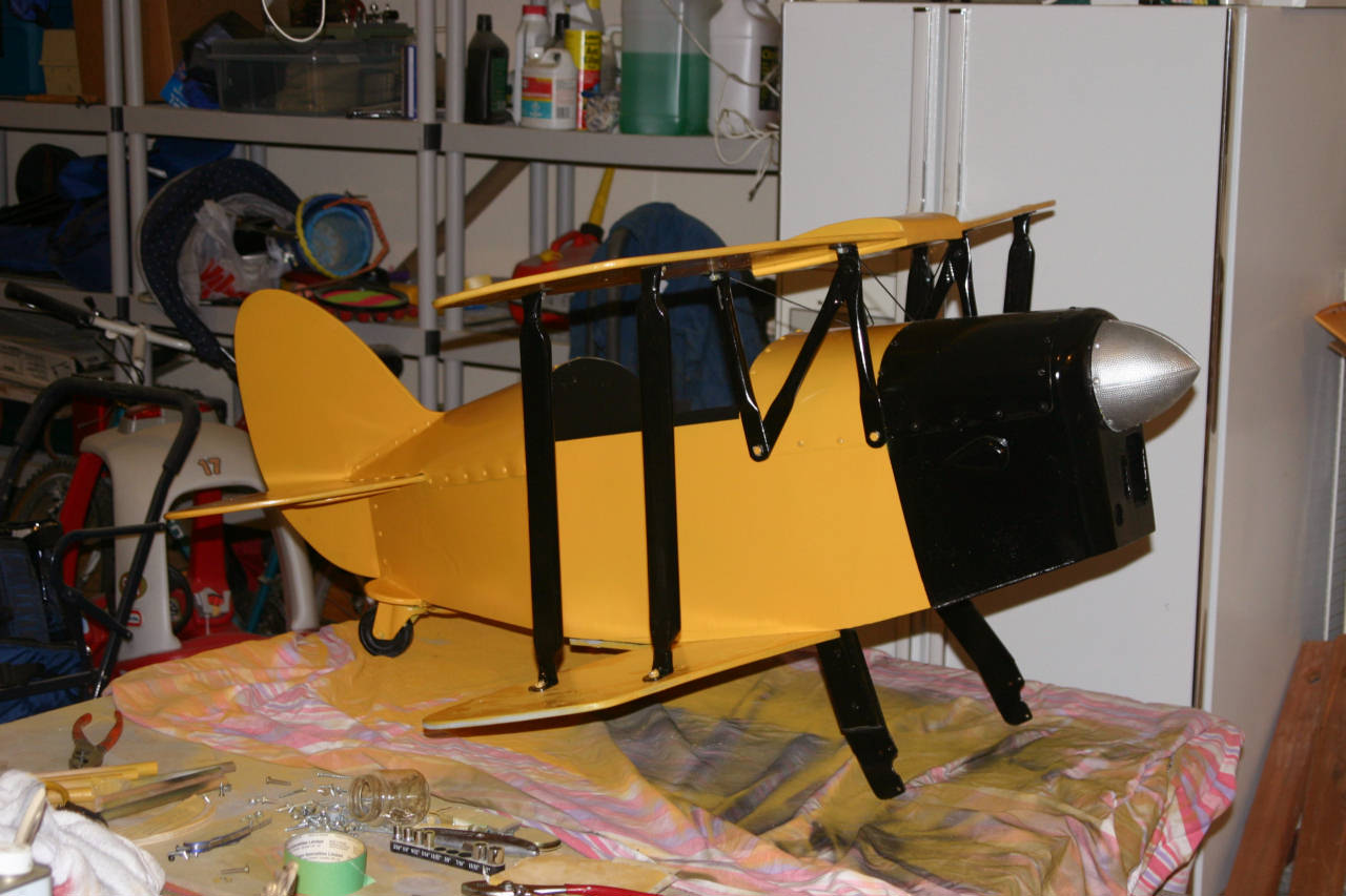 Painting continues. The upper and lower wings have now been completed, the interior of the fuselage has been sprayed a flat black, the nose and landing gear struts a nice glossy black, and I am now onto the yellow (called Marigold) on the fuselage. |